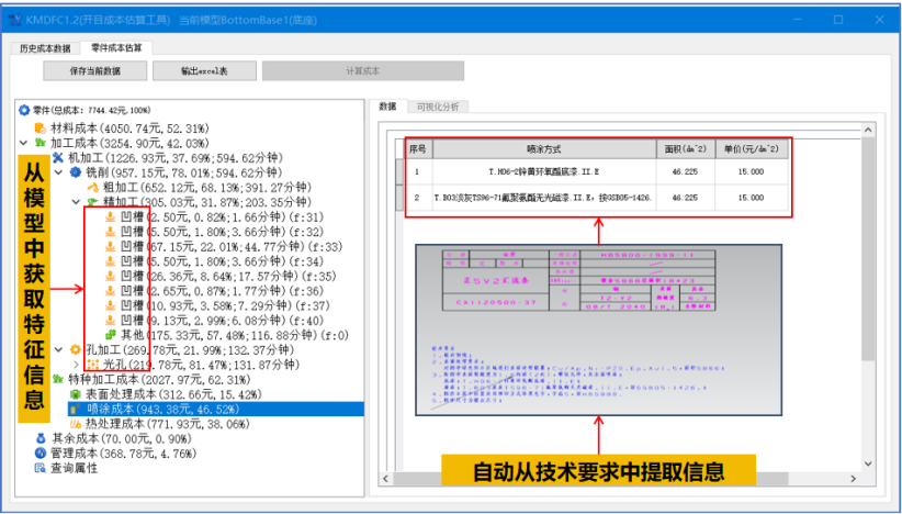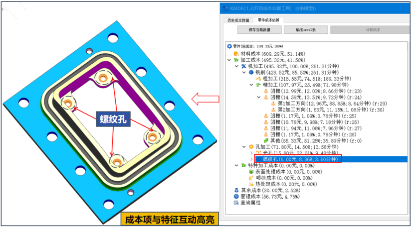 • 成本項與制造特征直接關聯顯示,即時估算加工成本