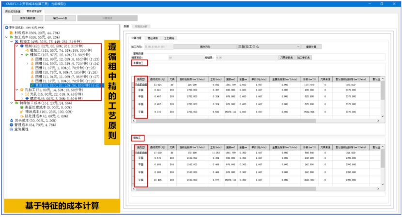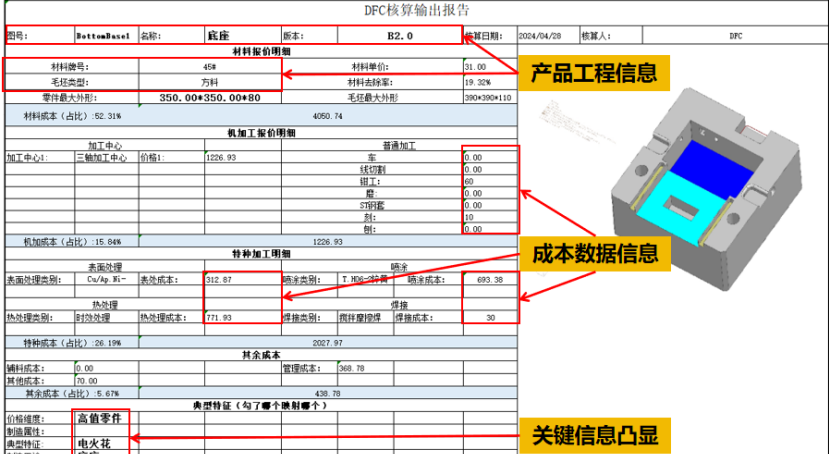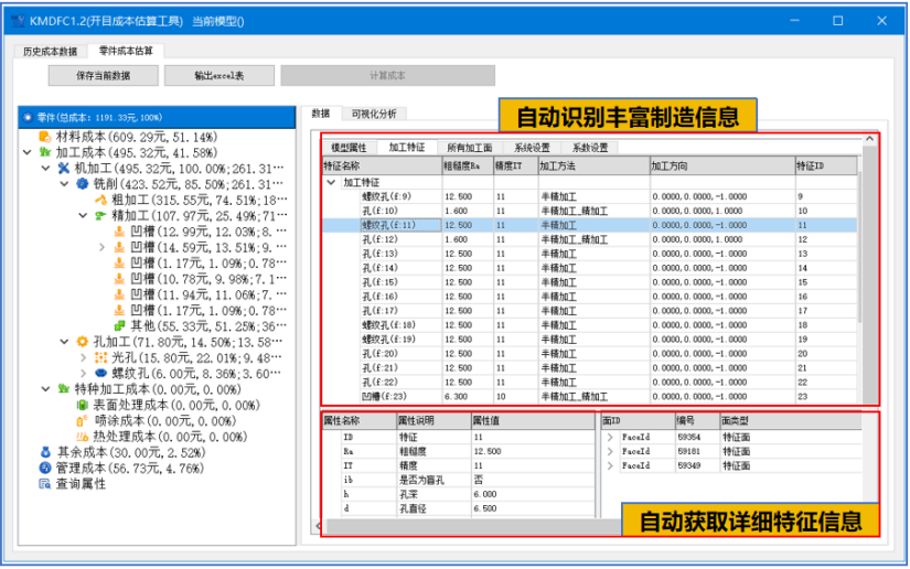 開目3DDFC 是一款基于 MBD 模型和工藝知識庫的專業三維制造成本分析與估算軟件,在不依賴詳細工藝路線的情況下,根據零件幾何信息和精度信息一鍵式完成成本估算。該軟件充分融入“并行工程”的關鍵思想,并基于開目的三維設計模型特征識別技術,以及零件加工成本計算模型,能快速獲得相對準確的加工成本。為面向成本的設計優化提供參考指引,也為企業對外產品報價或產品外協件采購價格提供量化依據,實現降本增效。