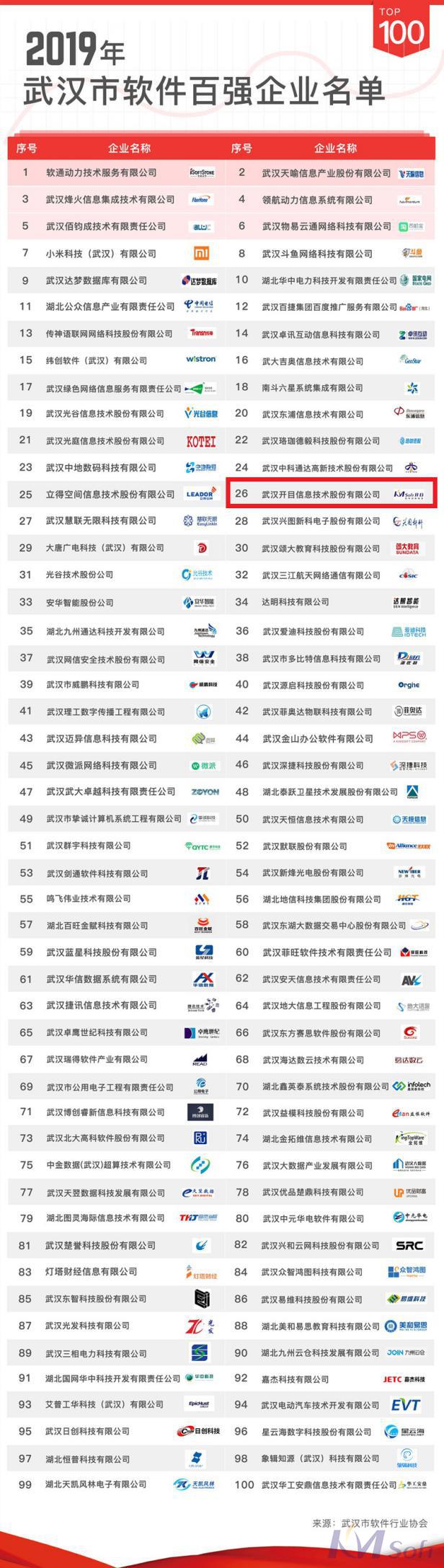 7月31日,武漢市經(jīng)濟(jì)和信息化局、武漢市軟件行業(yè)協(xié)會發(fā)布了“2019年武漢市軟件百強(qiáng)企業(yè)發(fā)布會”,武漢開目信息技術(shù)股份有限公司光榮入選本次百強(qiáng)榜單。