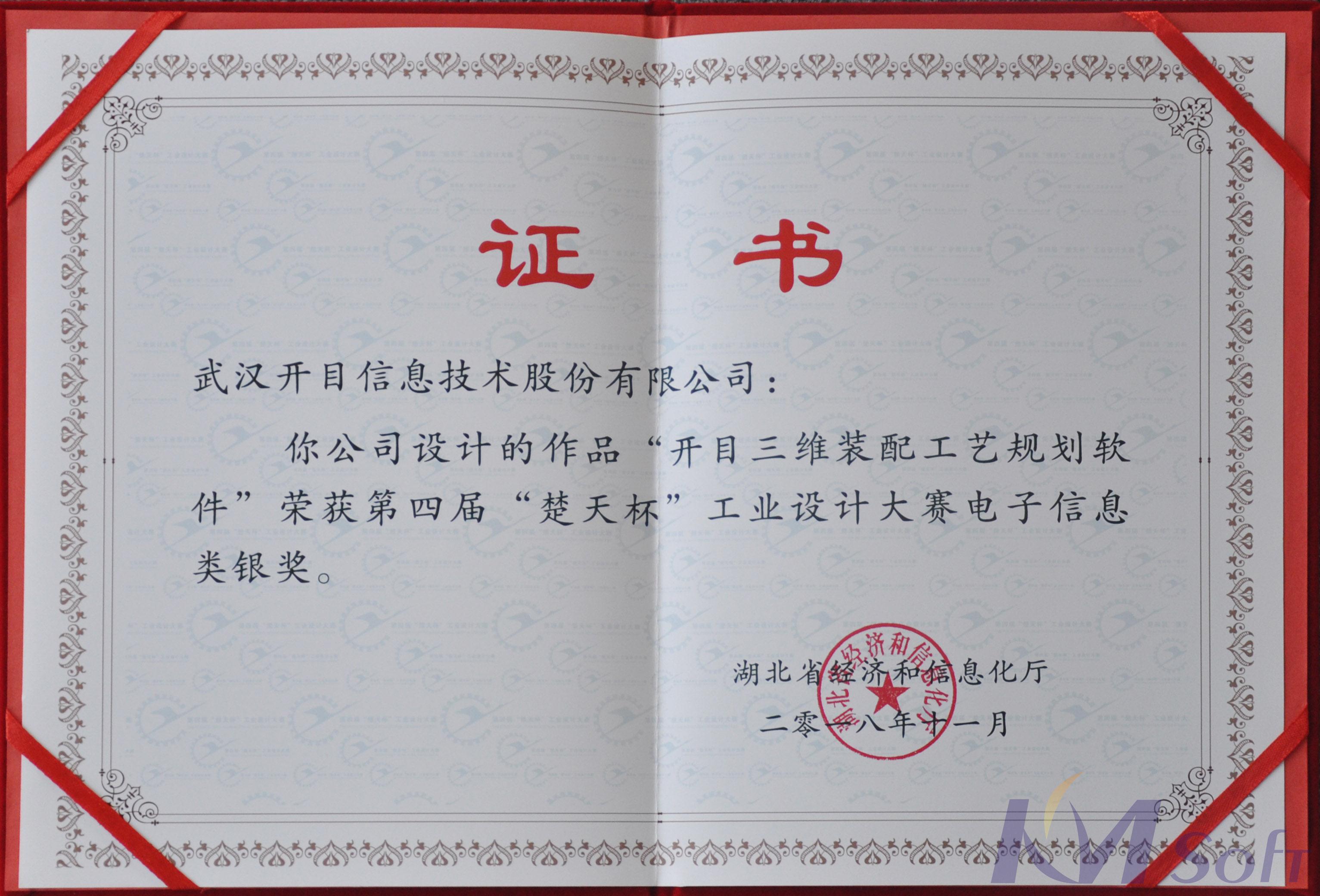 2018年11月23日,由湖北省經信委主辦的第三屆中國優秀工業設計獎湖北分區賽暨第四屆“楚天杯”工業設計大賽獲獎作品展暨頒獎儀式在武漢隆重舉行,武漢開目信息技術股份有限公司自主研制的開目三維裝配工藝規劃軟件3DAST榮獲第四屆“楚天杯”工業設計大賽銀獎。