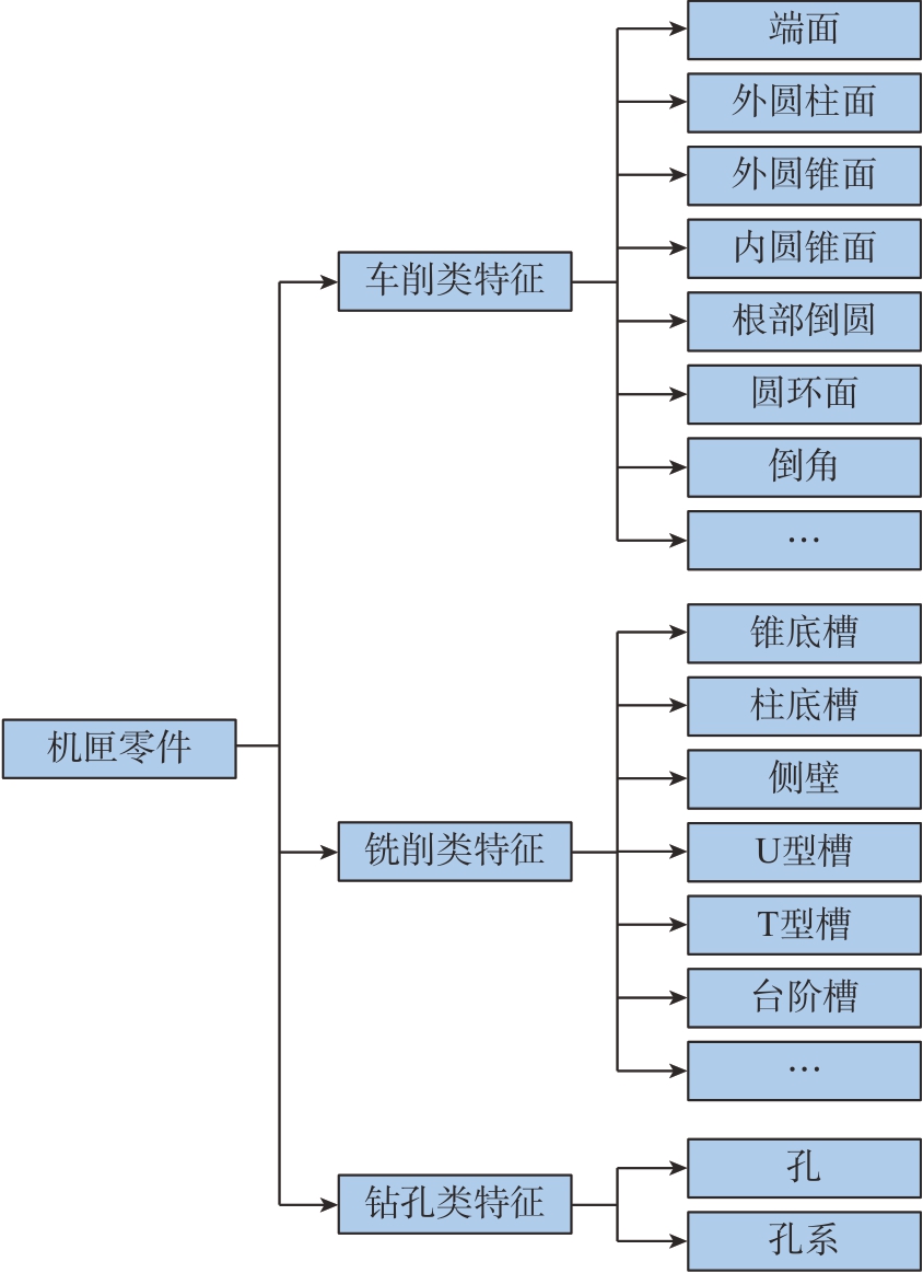 機匣零件特征主要分為回轉面系、錐底槽、側壁、孔系、平面、環槽等類型特征,按照加工方法進行定義,如圖2 所示。