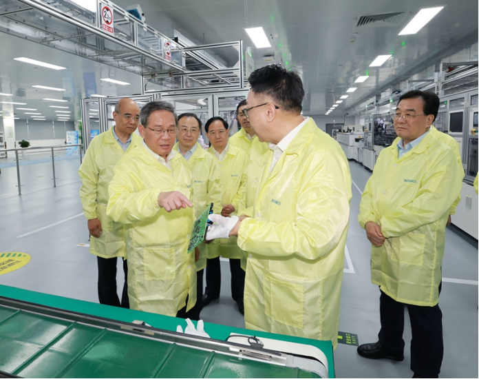 這是7月2日,李強在蘇州匯川技術有限公司參觀生產車間,了解企業研發生產等情況。新華社記者 王曄 攝
