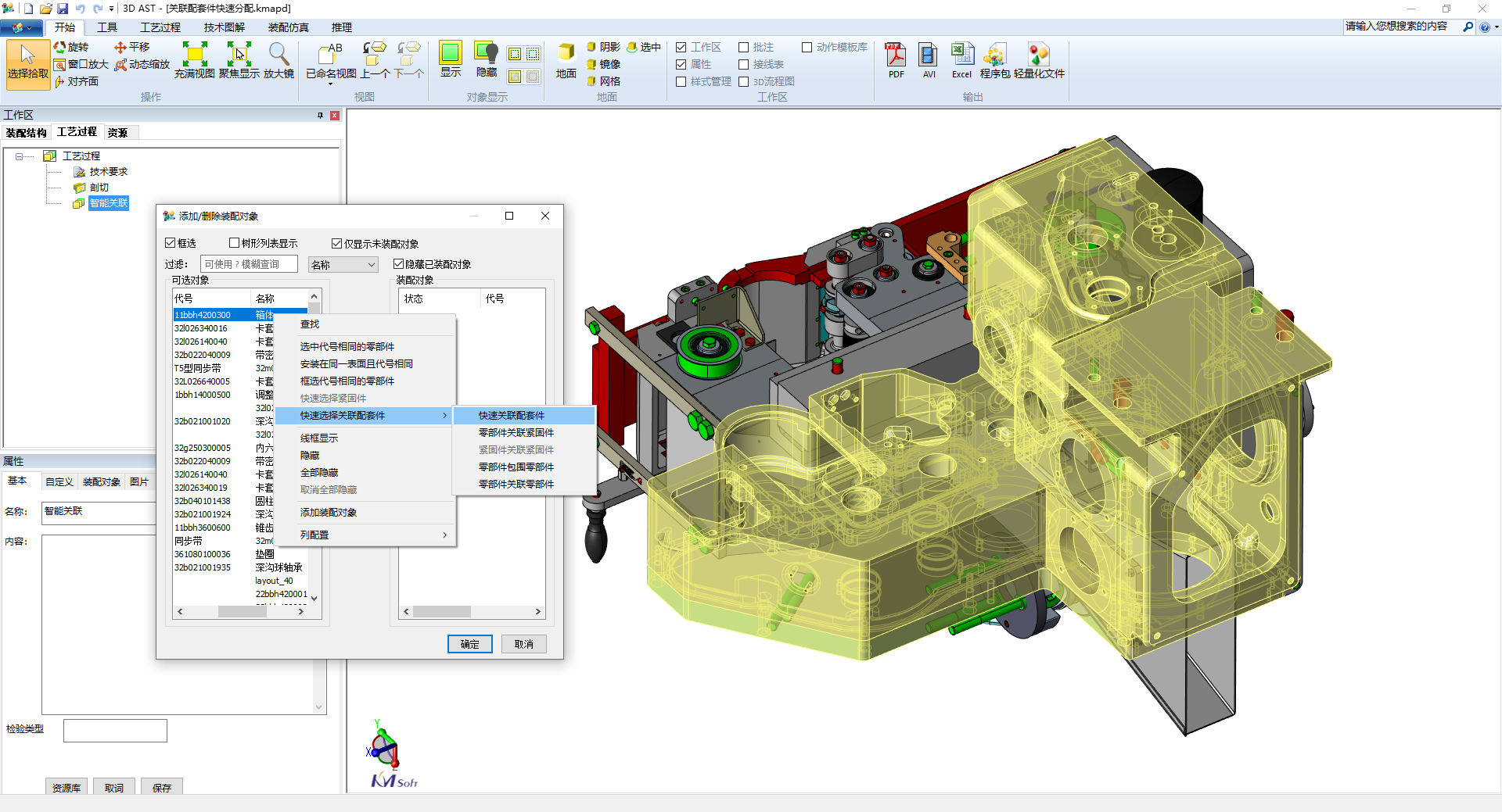 開目3DAST研發團隊通過三維裝配模型零部件特征之間的拓撲關系,基于國際、國家及行業標準和開目在工業軟件多年的技術積累,自主研發了零部件智能關聯算法,包括零部件關聯緊固件、緊固件關聯緊固件、零部件包圍零部件等。可以在選擇某零部件的同時智能推斷出與其有關聯關系的零部件,進行一次性添加,實現工序規劃階段零件的選取效率提升50%以上。