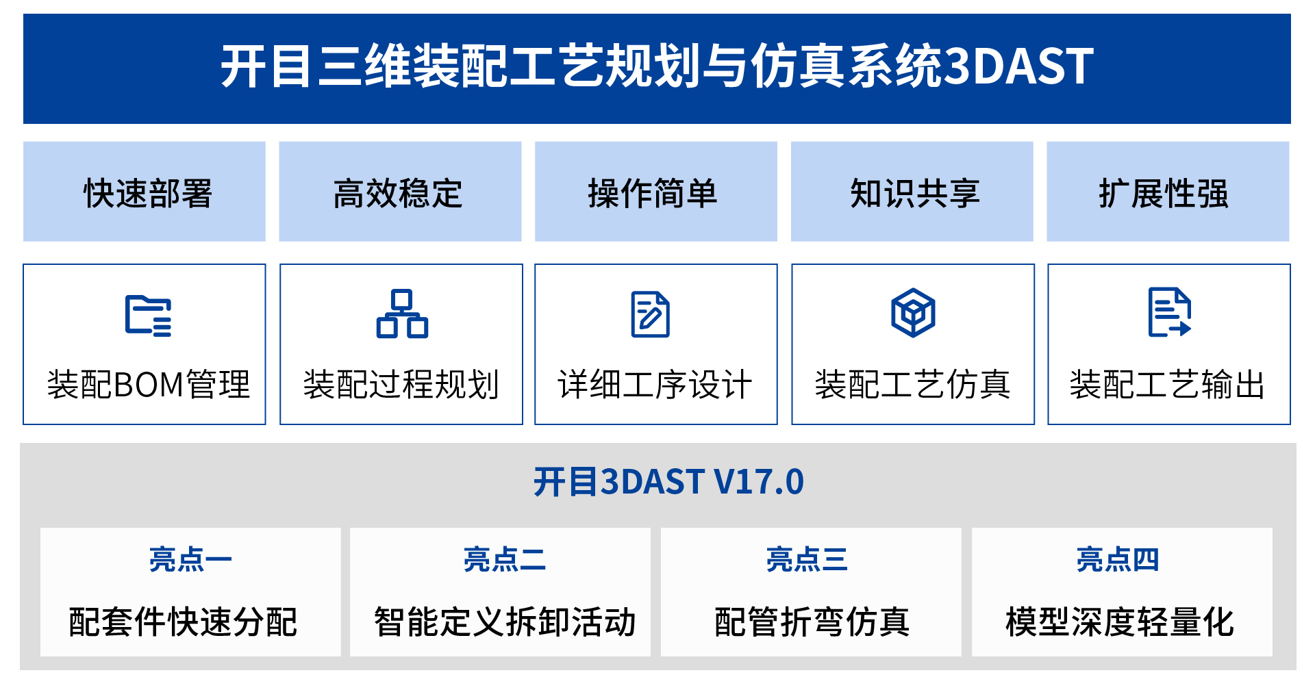 隨著制造企業數字化轉型、智能化升級的深入推進,在裝配工藝設計過程中,高端制造用戶對工藝路徑智能推薦、復雜空間拓撲結構中大型裝配體的工藝規劃、大模型文件深度輕量化、軟件易用性等方面提出了新需求。為此,開目軟件以用戶需求為導向,憑借深厚的技術積累,重磅推出3DAST 17.0新版本,亮點頗多。