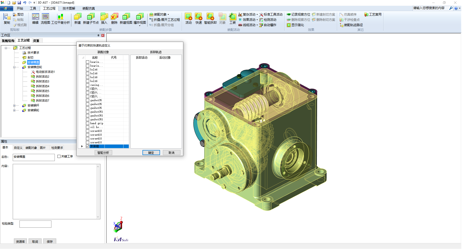 結合經典圖形算法及數據結構,開目3DAST研發團隊開發出基于約束的快速定義拆卸活動功能。針對工序進行拆卸活動時,對工序的對象進行空間位置與接觸關系的分析,自動推薦該工序零部件的拆卸順序與運動軌跡。如在減速器箱蓋的裝配規劃中,通過智能拆卸功能可以將軸承蓋、箱蓋及各緊固件進行快速規劃,整體操作效率提升20%以上。
