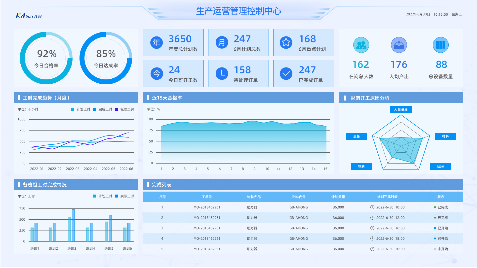 KMMOM支持多種途徑的訂單接收和拆分、排程優化以及資源分配和任務下達,實現訂單狀態的實時動態追蹤,以及多層級多維度的生產監控;
