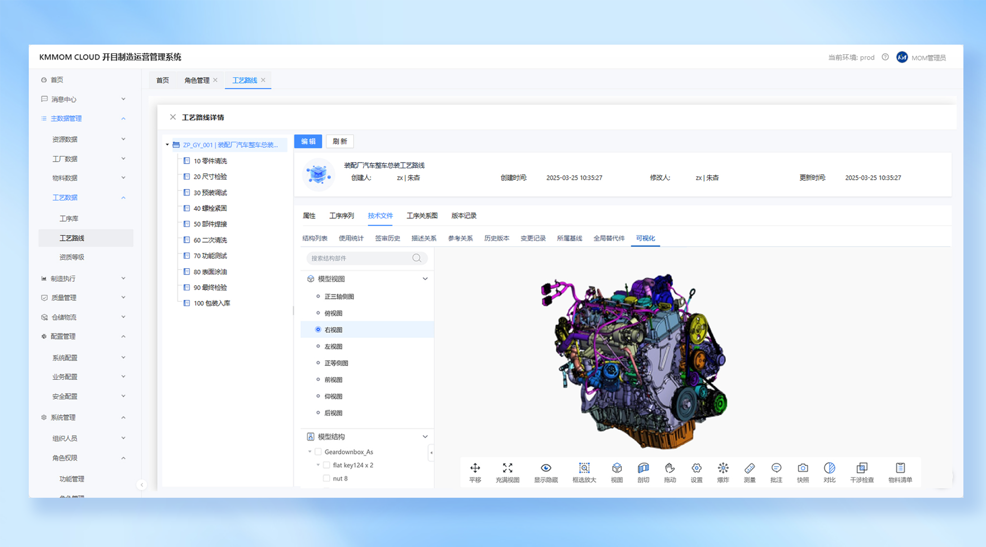目前,KMMOM CLOUD V3.0已在某高端裝備制造企業成功落地實施,實現了從頂層ERP系統(園區網)到底層產線系統(工控網)的無縫連接,確保了系統的互聯互通;同時,CAPP、ERP、MOM等關鍵系統也完成了國產化替代和重構。該系統實現了制造業務域模型的規范化,涵蓋了物料、BOM、工藝、工裝、設備、計劃、轉工、工卡、工時、維修大綱等多個方面,覆蓋了從零件毛坯制造、熱處理、零件加工到發動機修理裝配等多個專業領域和多個工廠的生產管理及協同工作,實現了從企業級計劃能力分析到工序級任務調度管理的自制全流程管控。