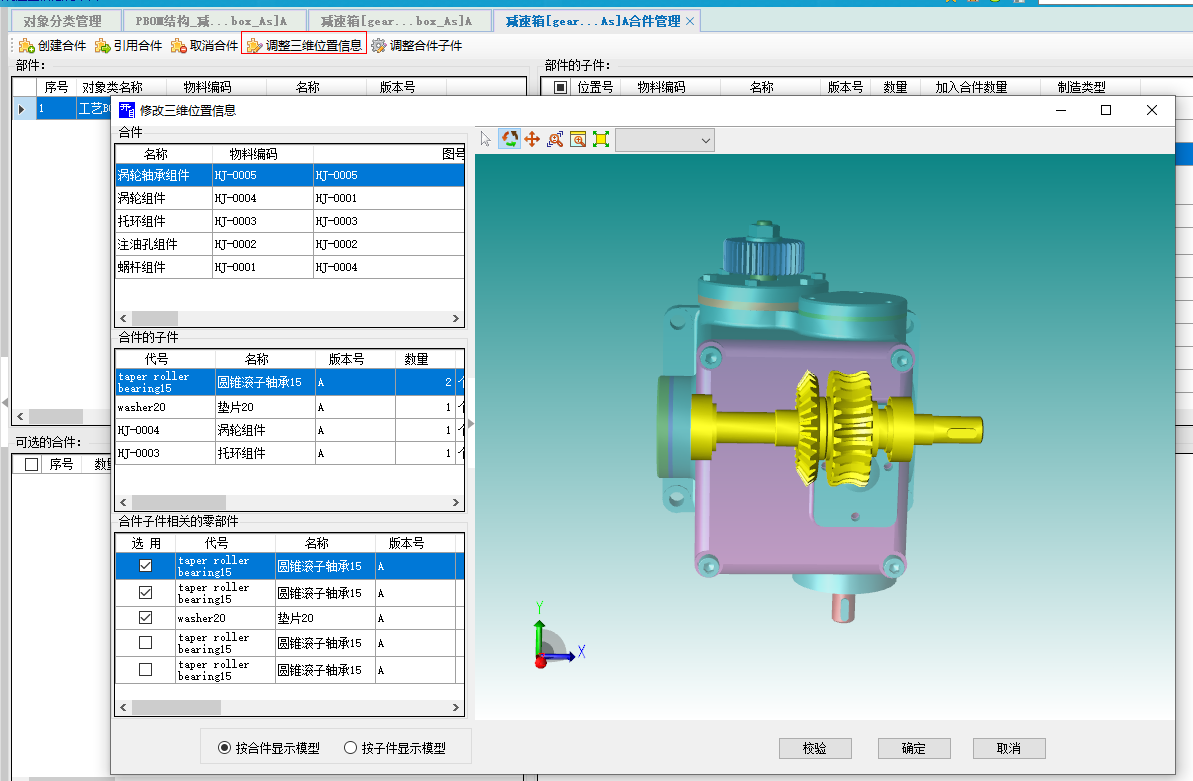 合件的維護是PBOM調整的重要工作之一,開目eCOL PLM通過引用合件的三維模型以及合件的變更,可保障PBOM中結構的完整性和一致性。新版本PLM能夠輔助企業規范合件庫的管理,實現合件庫的有效應用,并且提供批量的合件操作功能,如部件批量自動檢索、合件引用、合件變更等,大幅提供工作效率。同時也支持部件下合件的三維模型設計,基于此模型來調整合件中具體的零件實例,以此支持基于具體位置的零件的合件生成,以及滿足左右件等合件生成的要求。