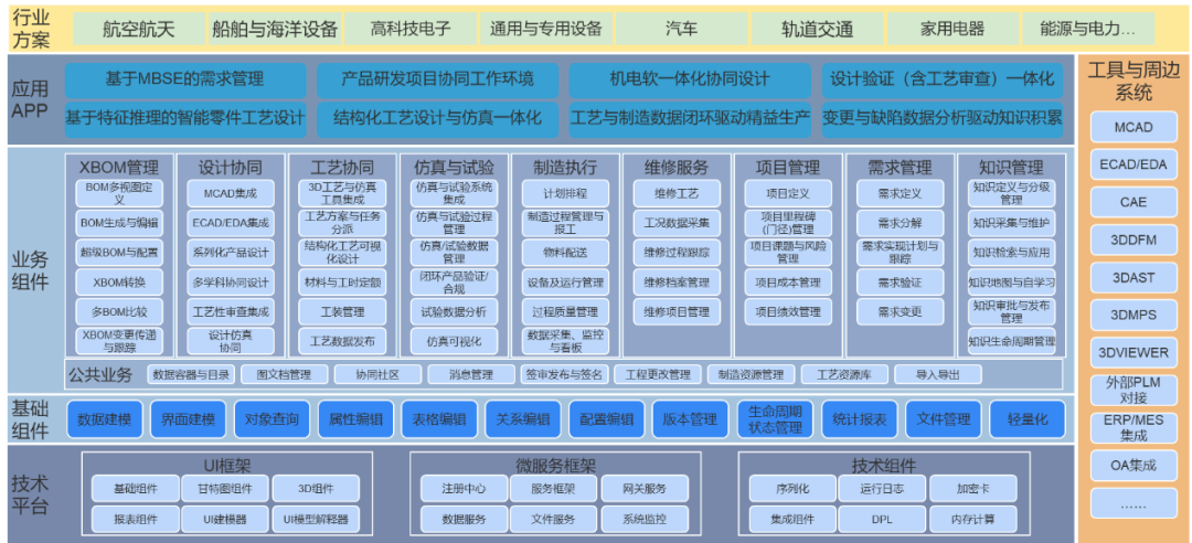 例如,在航空航天領域,中航某集團公司借助KMPLM CLOUD產品,構建了從設計數據接收到工藝設計與管理、車間制造、維護服務的全生命周期管理平臺,建立了基于可擴展的XBOM機制為基礎、上下游可追溯的EBOM/PBOM/MBOM/OBOM/BBOM/SBOM構型與技術狀態管控能力;統一了各種型號的工藝數據技術狀態管控模式,實現單一數據源;建立了工藝知識庫,實現基于知識的結構化工藝設計;建立了統一的項目管理、任務管理和流程管理模型,實現完整的工作閉環和業績考核;建立了基于微服務、可擴展、可延伸到外部供應商應用的開放式系統架構,最終實現了國產化、智能化、三維化、結構化的工藝替代。未來,中航某集團公司還將繼續以KMPLM CLOUD產品為基礎,進一步完善貫穿飛機從設計到退役的全生命周期技術狀態管控體系。